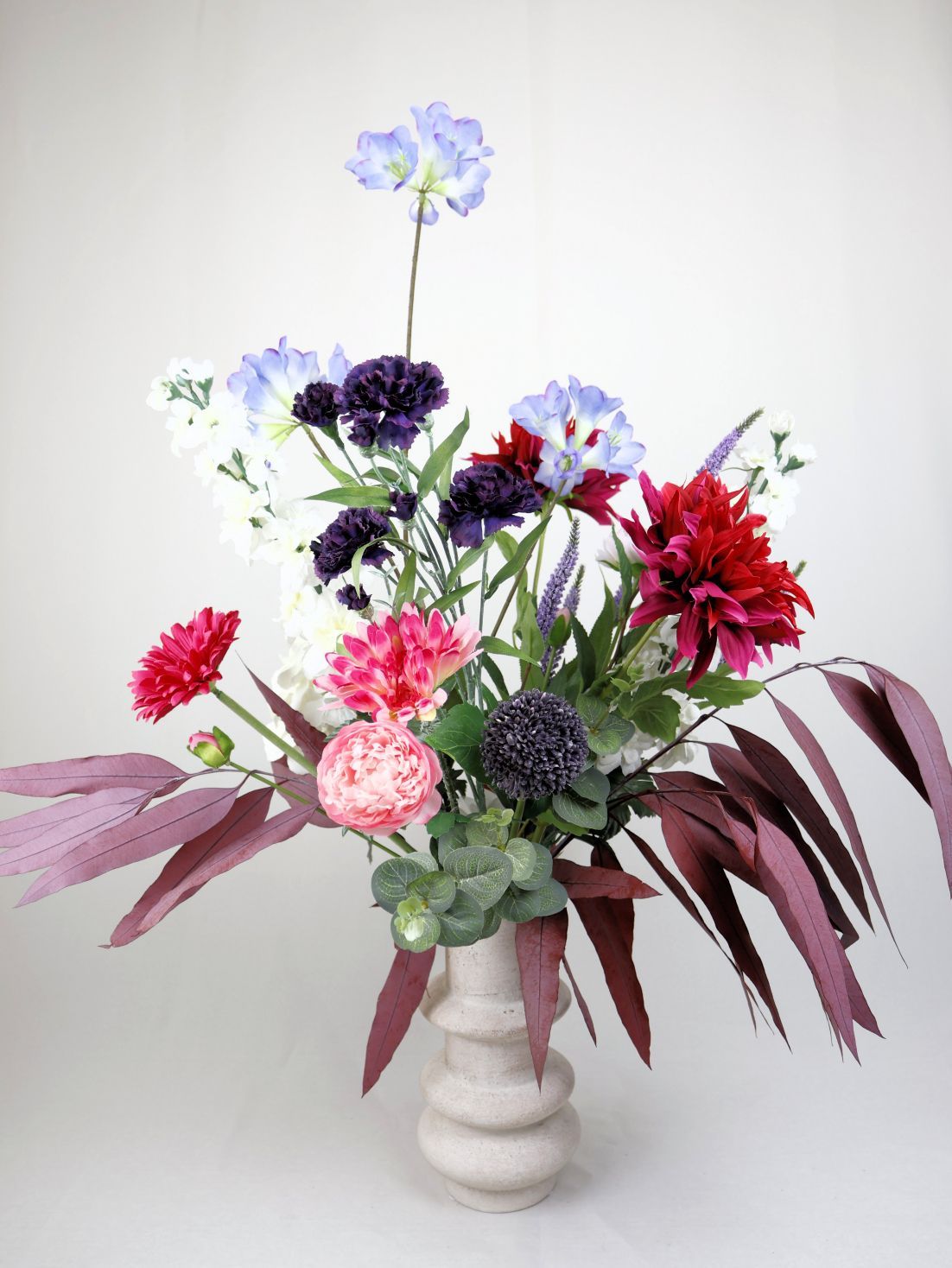 Boeket Ruby, zoals afgebeeld, is een groot en indrukwekkend zijden boeket in een elegante crèmekleurige vaas.