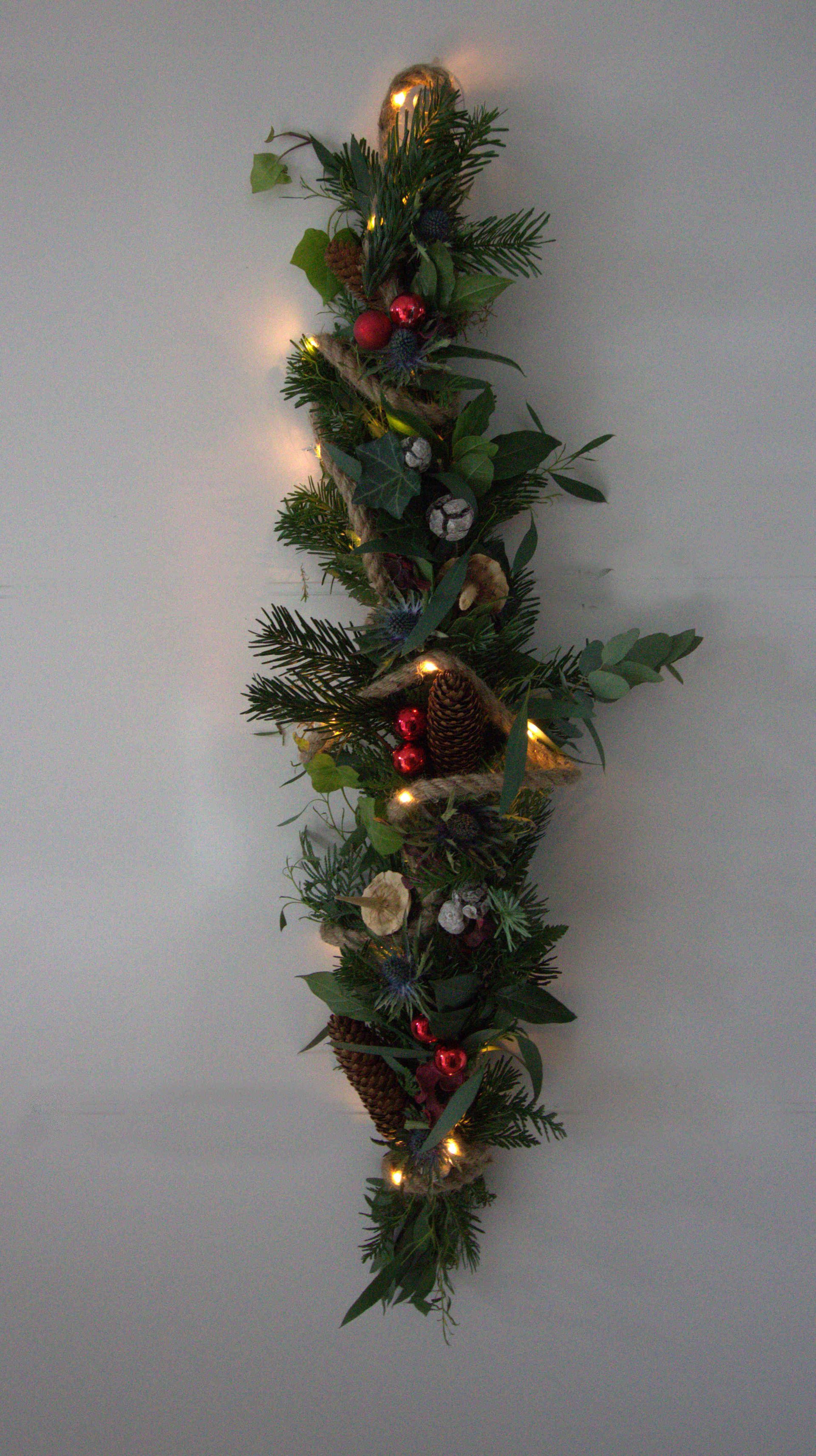 Ontdek hoe je een prachtige kerstguirlande (75cm) kunt maken om je voordeur te versieren. Tijdens deze workshop gebruiken we verschillende soorten groen, zoals nobilus, juniperus, eucalypthus, mos en nog andere groene materialen, om een mooie guirlande te maken. Deze diverse soorten groen binden we samen tot een slinger en versieren dit met diverse kerstmaterialen. Bovendien voegen we robuust touw met sfeervolle lichtjes toe om je guirlande extra sfeervol te maken.